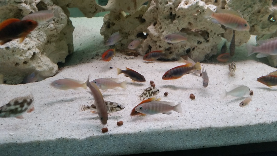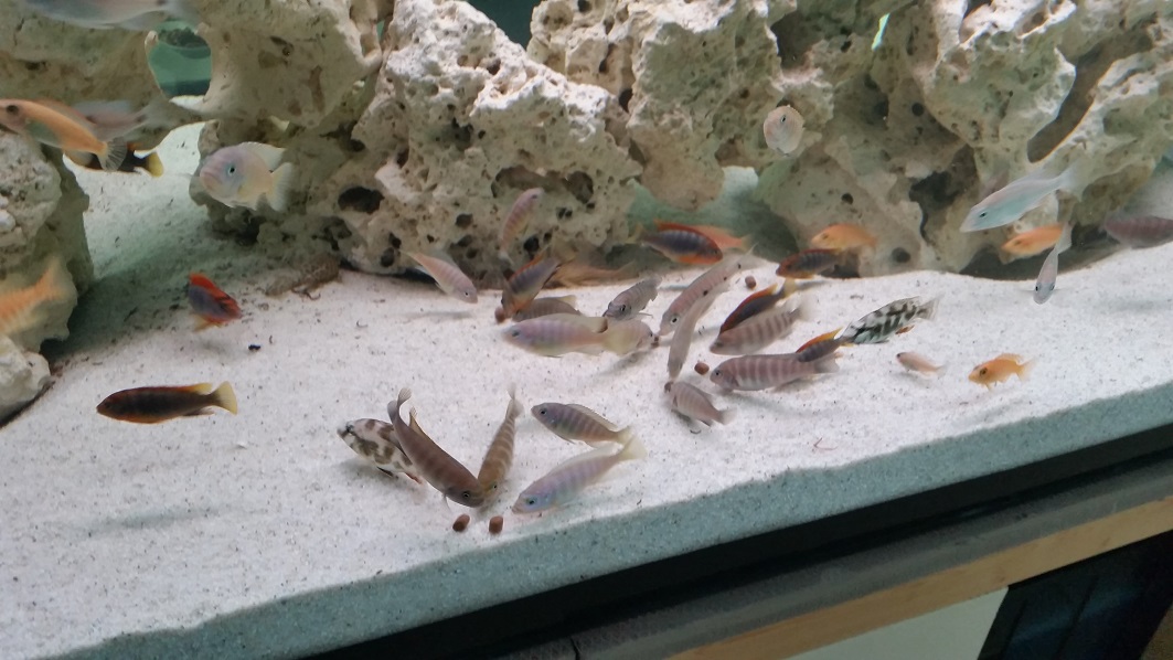 mal som problém s kalom, stále sa mi usádzal prevažne na jednom mieste, čo sa mi vôbec nepáčilo... Skúšal som všetko aby som ho poslal do filtra kde patrí . Natáčal som trysky – menil smer prúdenia vody, menil som výkon čerpadla, menil usporiadanie kameňov ... Všetko bolo márne. Zhodou okolnosti mi známi daroval pár hrsti kvalitných bielkovinových granúl s vysokým obsahom Astaxantínu (na lepšie sfarbenie rýb). Jednak sa ryby začali krásne vyfarbovať čo je super no čo je ešte lepšie, môj problém s kalom sa úplne vytratil. Finta je v tom, že granule sú onoho väčšie ako papuľky rýb takže trvá cca hodinu kým ju poobhrýzajú . Pripomína to rybací futbal, kde sa snaží dostať mojich skoro 150 futbalistov k lopte
