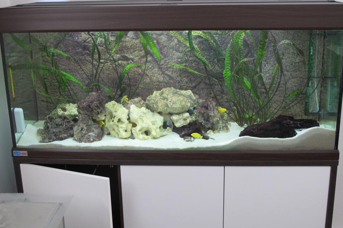 Ryby v nádrži: 8ks Labidochromis Caeruleus Yellow, 7ks Melanochromis Maingano, 10 Labidochromis Hongi Sweden