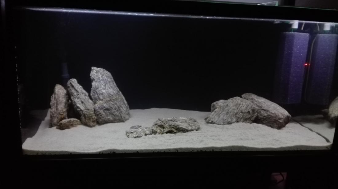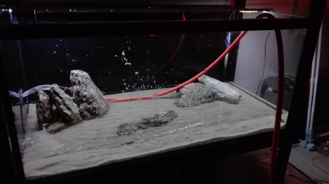 Dekorácia v nádrži: Dno písek 0,4-0,8mm, kameny, pozadí černá fólie.