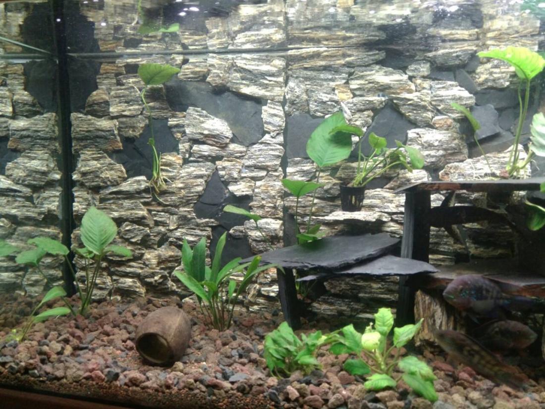 Dekorácia v nádrži: Pozadie z čiernej bridlice a skameneného dreva,jaskyne z bridlice, korene, kokos atd.
