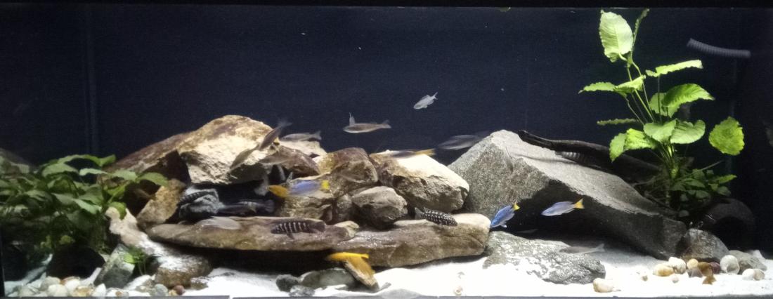 Potreboval som odchytiť 4 olivaceusi keďže už tri samice sa vytierali a strašne sa rozmáhali. A to nešlo bez vybratia kameňov, takže došlo k čiastočnej prerábke. Nechal som len pár. Z pôvodných 6ks ostal tiež pár J.marlieri. Ostatné sú v pôvodných počtoch, similisi museli byť už skôr preložené do samostatnej nádrže. Okrem N.cylindricus sa všetko aspoň raz vytrelo. Momentálne na moju veľkú radosť majú mladé L.kendali (ešte nerozplávané), ktoré ako som zistil nie je úplne ľahké odchovať. Pred pár dňami som priniesol Chalinochromis bifernatus (4ks) a Altolamprologus calvus white chaitika (6ks).