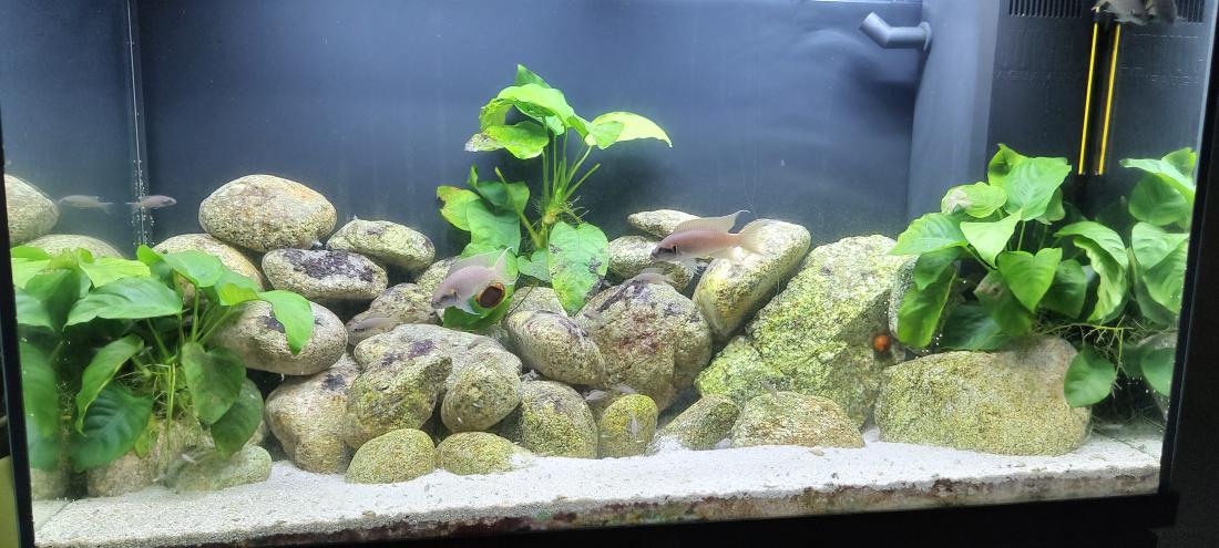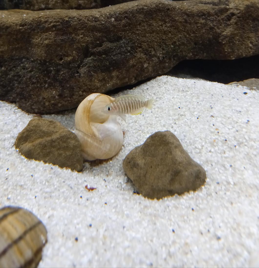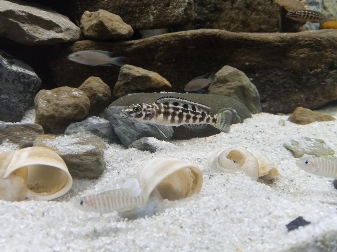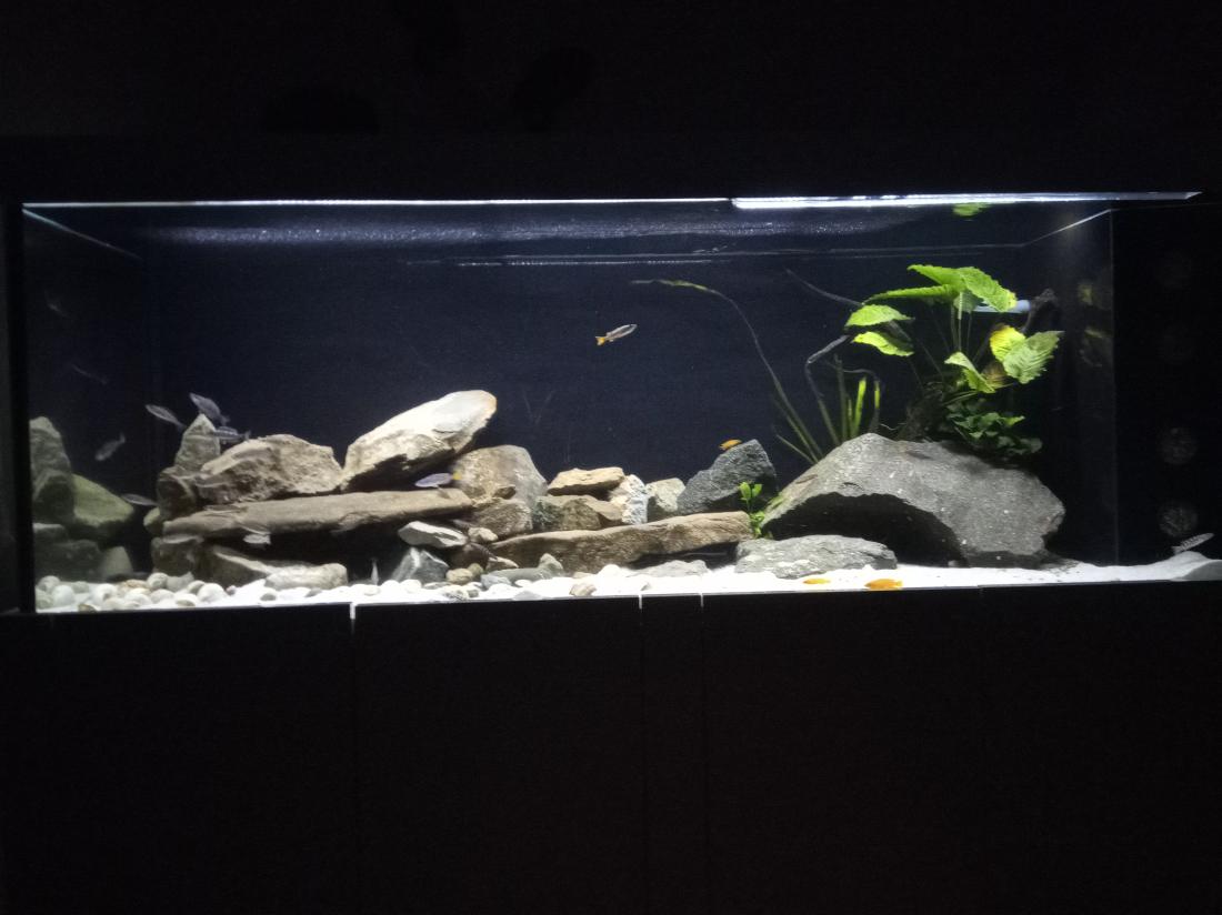 Ryby v nádrži: Lamprologus similis - 8ks, Lepidiolamprologus kendalli - 4ks, Neolamprologus leleupi - 6ks, Julidochromis marlieri - 6ks, Neolamprologus cylindricus - 4ks, Neolamprologus olivaceus - 4ks, Cyprichromis leptosoma utinta - 17ks. Všetko mladé 5-6cm