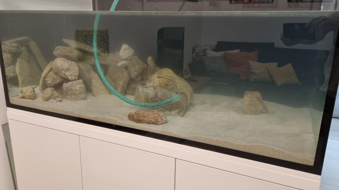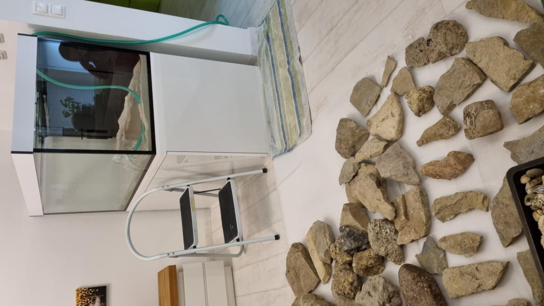 Poprosil som Fuljerovcov o pomoc so "štarovacím balíčkom pre zabehnutie"... a prišiel zabehnutý filter a medzi náplňami dokonca už bol dlhšie používaný "tanganyický" matrix + sáčok s extra bio kultúrou od nich). Kamene, ktoré už netrpezlivo čakali asi týždeň na terase, si teda ešte riadne počkali, kým som zistil, čo kde a ako zapojiť a odhodlal sa konečne k nasypaniu prvého vrecka piesku a napusteniu prvých pár litrov vody