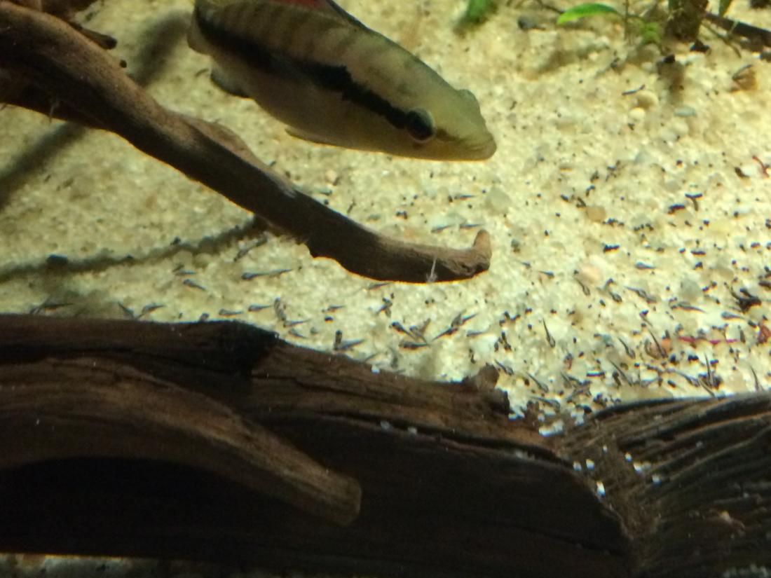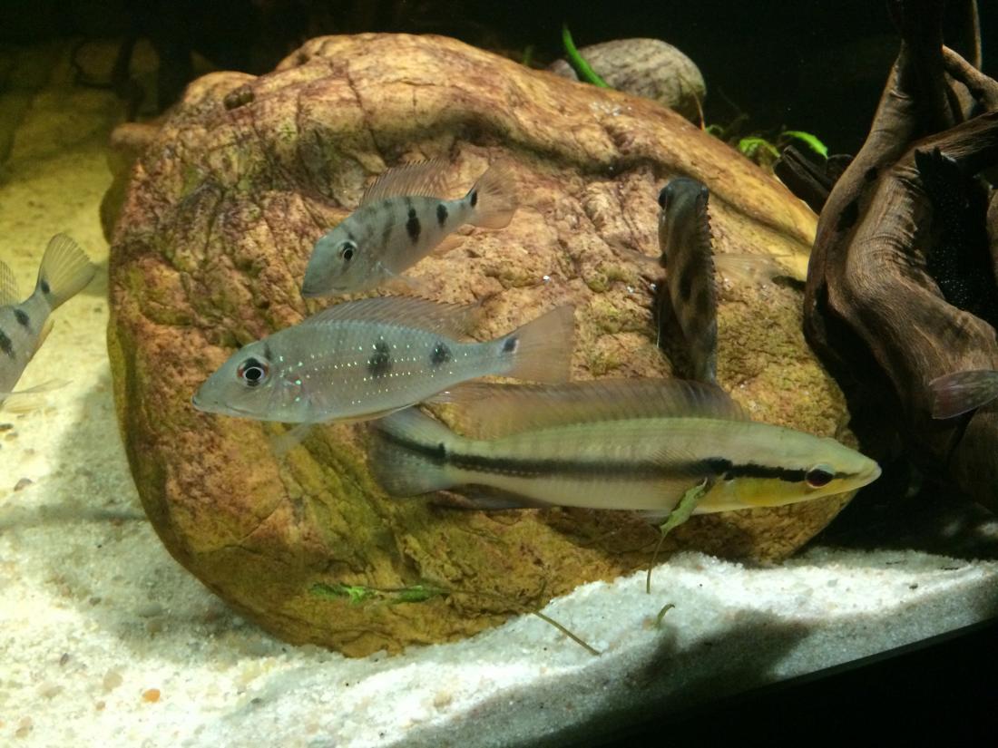 Zatim si vybrali část s kořeny, kde se jim daří vodit malé v poklidu. Samec občas vyrazí do volného prostoru akva a prozene