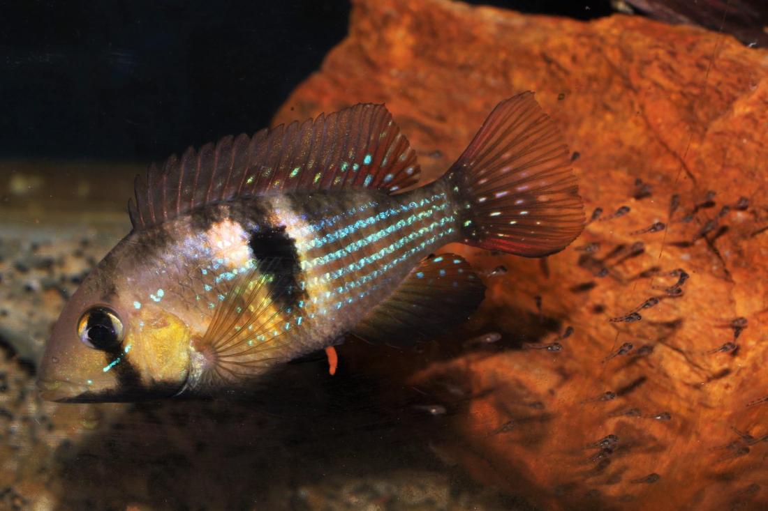 Znášanlivosť: Mimo tření jsou ostatním rybám jsou mírné. Při tření velmi důrazně brání své teritoriom. Příliš malé ryby můžou považovat za kořist. Rybky neničí rostliny, ale můžou je vyhrabávat.