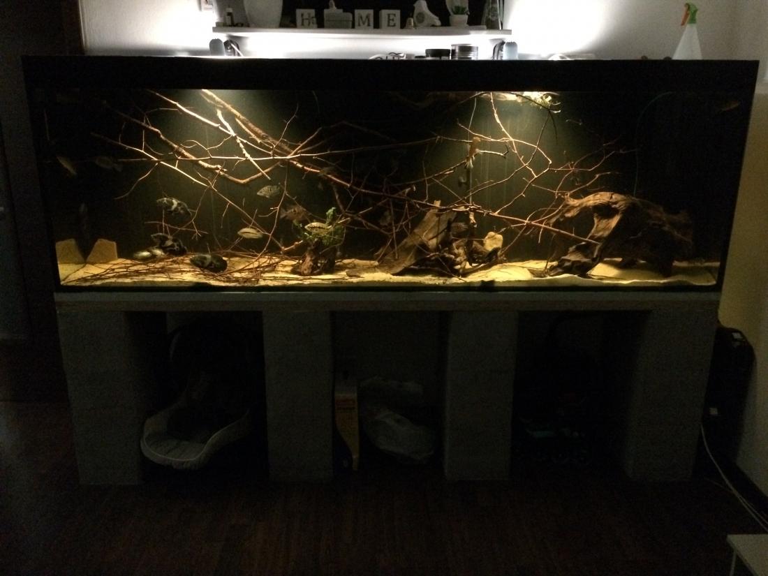 Povodne malo byt akvarko 220x70x70, ale nasiel som toto, tak som po rodinnom zvazeni urobil tento kompromis, nakoniec mi to aj celkom vyhovuje, lebo mi akvarko vyplnilo cely potencial steny, pri ktorej stoji a velmi nezasahuje do priestoru obyvacky, ...vyska je dost na hrane, preto tam nemam kamene, lebo ledva sa dotknem dna, velka zabava bola, ked mi na dno spadol teplomer :D ...uz som skusal vela typov biotopov ameriky aj afriky, ale toto BW najviac lahodi mojmu oku, aj ked osadka nie je striktne zlozena z ryb amazonie, ale zatial spolu funguju dobre, cichla obcas nieco male zozerie, ale to je este stale dost vynimocny pripad, konare som sa nijak nesnazil aranzovat, len som ich tam rozne nastrkal, aby to vyzeralo co najviac prirodzene