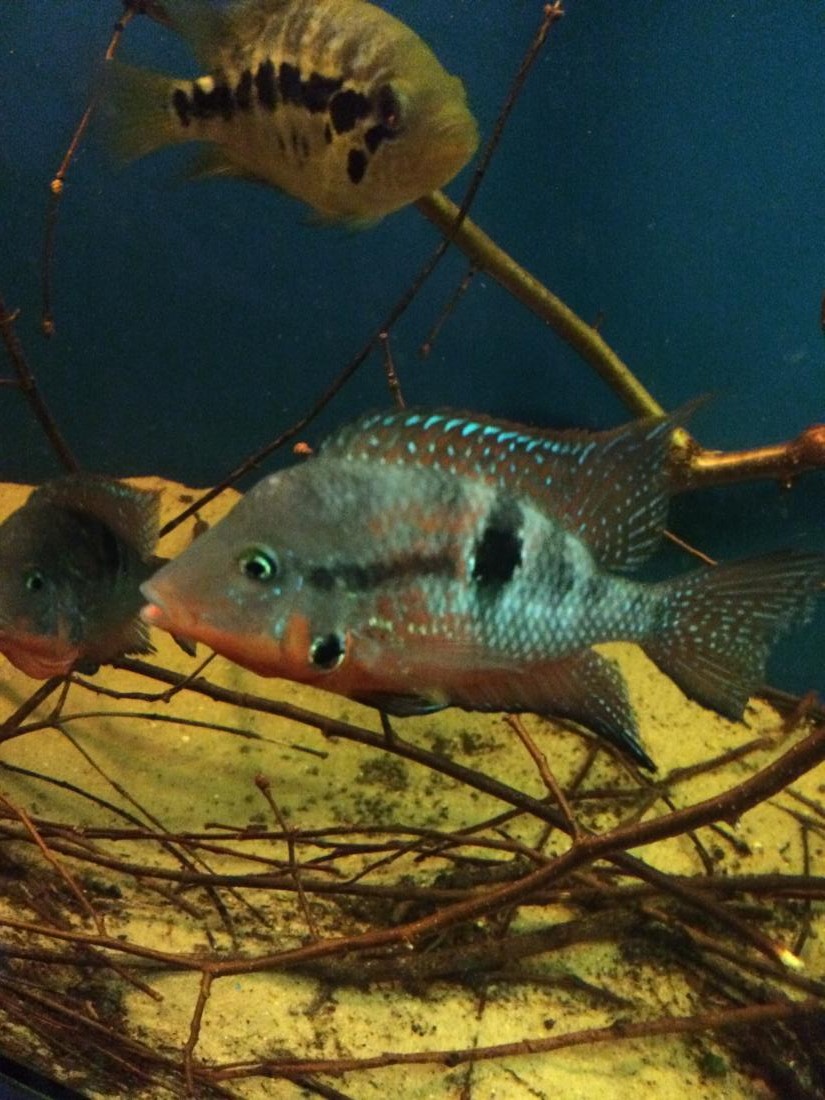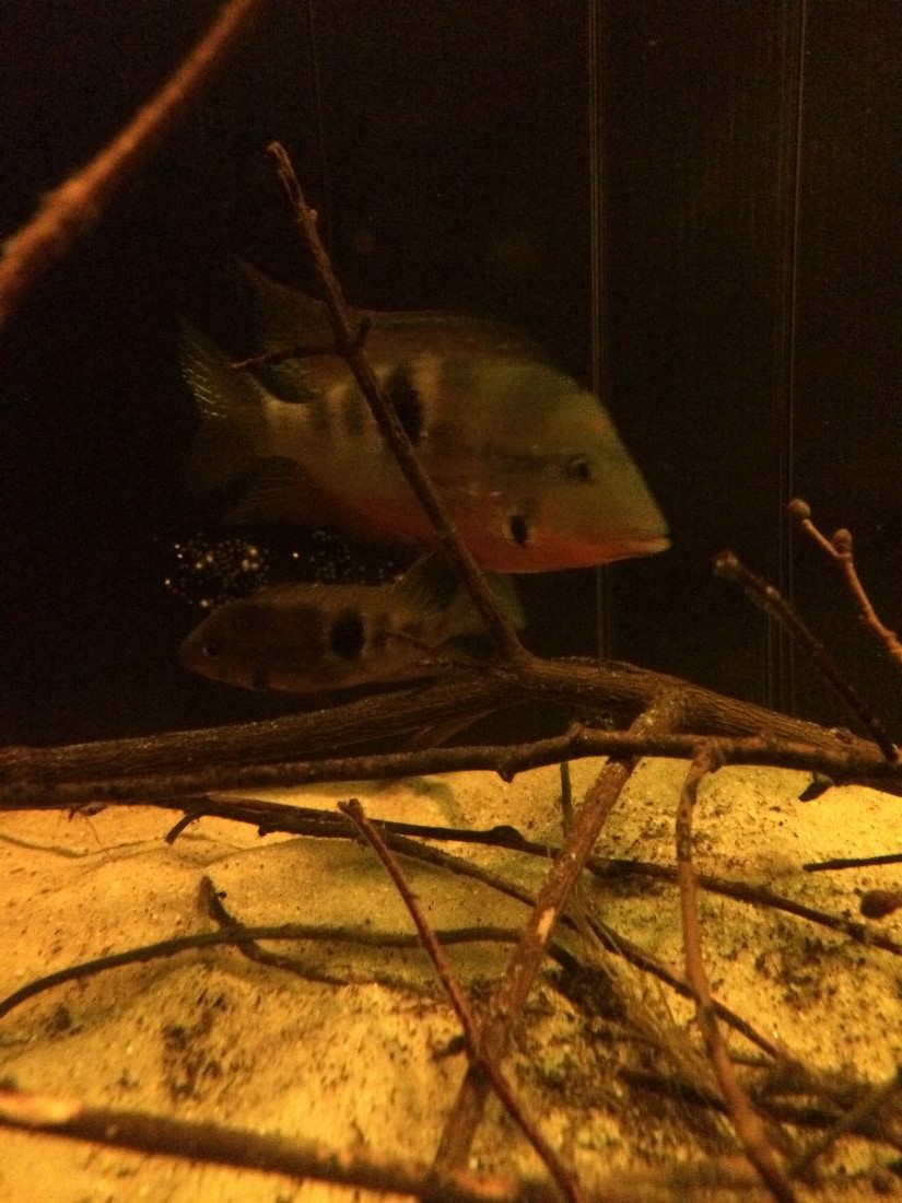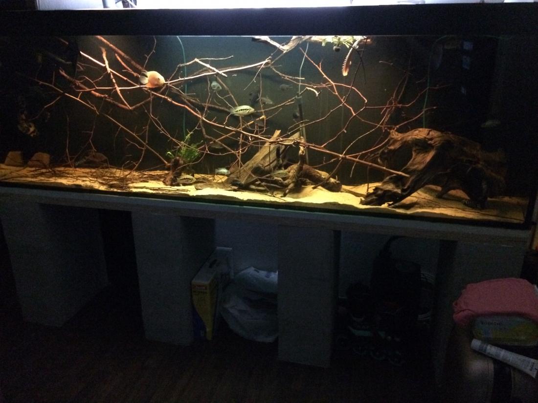 Ryby v nádrži: 4x ocelatus, 5x parachromis friedrichstalii (loiselei), 2x cichla monoculus, 2x meeki, 8x nigrofasciata, 3x bala shark, 1x bichir senegal, 2x akara modra electric blue, 1x heros severus red spot, 1x gibik, 2x pardalis, 2x paratilapia polleni, ..... je to trochu ryby gulas ale zatial maju ryby od 7 do 13-14cm takze spolu absolutne spokojne vychadzaju, mam v plane skusit este hnede a zelene discusy a satanoperca daemon, samozrejme oddelene od tychto, ale to sa este uvidi, kedy sa k nim dostanem, nechavam tomu volny priebeh
