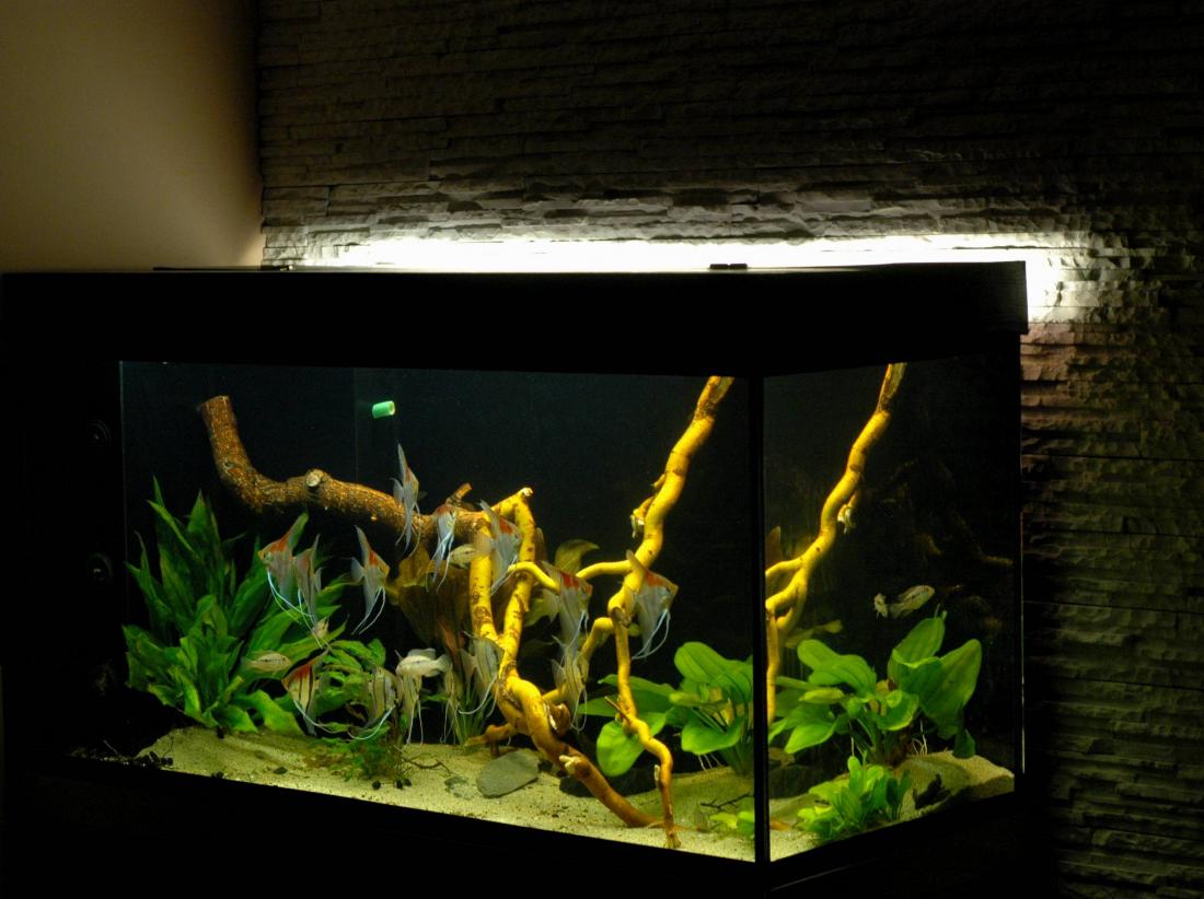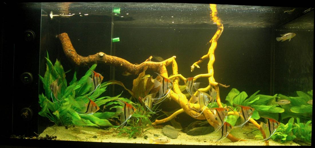 Ryby v nádrži: Pterophyllum sp. nanay 6x, Pterophyllum scalare "Manacapuru" 9x, Tahuantinsuyoa macantzatza 7x